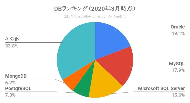 PostgreSQLは、オープンソースのオブジェクト関係リレーショナルデータベース関係システム(ORDBMS)です。2020年時点のシェアランキングは、4位です。やや人気のないDBと言えるでしょう。