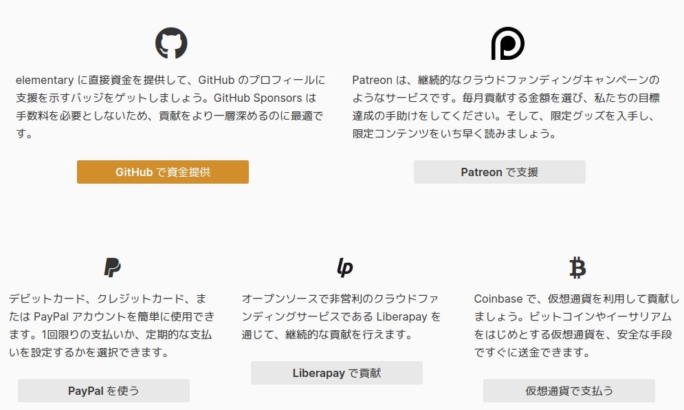 では、開発者としてのサポート以外に、どのようにOSSへ貢献する方法があるかと考え直した時、elementary OSのサイトで見かけた金銭的なサポートがパッと思いつきました。