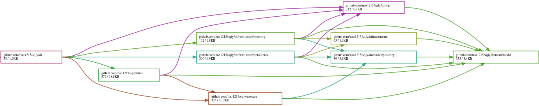 loov/goda で、sqlyパッケージ内の依存関係を確認すると、左(UIに近い部分)から右(DBに近い部分)に依存が流れていき、右端のmodelパッケージに依存が集まっている形になります。依存関係が破綻している部分がない(== 自分より上位レイヤーに依存しているパッケージがいない)ので、見た目上は綺麗な構成です。