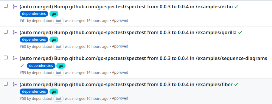 ……が、OSSを何十個も作っていると、Bump地獄に見舞われます。無心でPRをポチポチマージして回る羽目になります。気合をいれて開発中のOSSならまだしも、「もう自分も使ってないんだよな、このOSS」という温度感の場合でもライブラリ更新PRを手動マージしなければいけません。