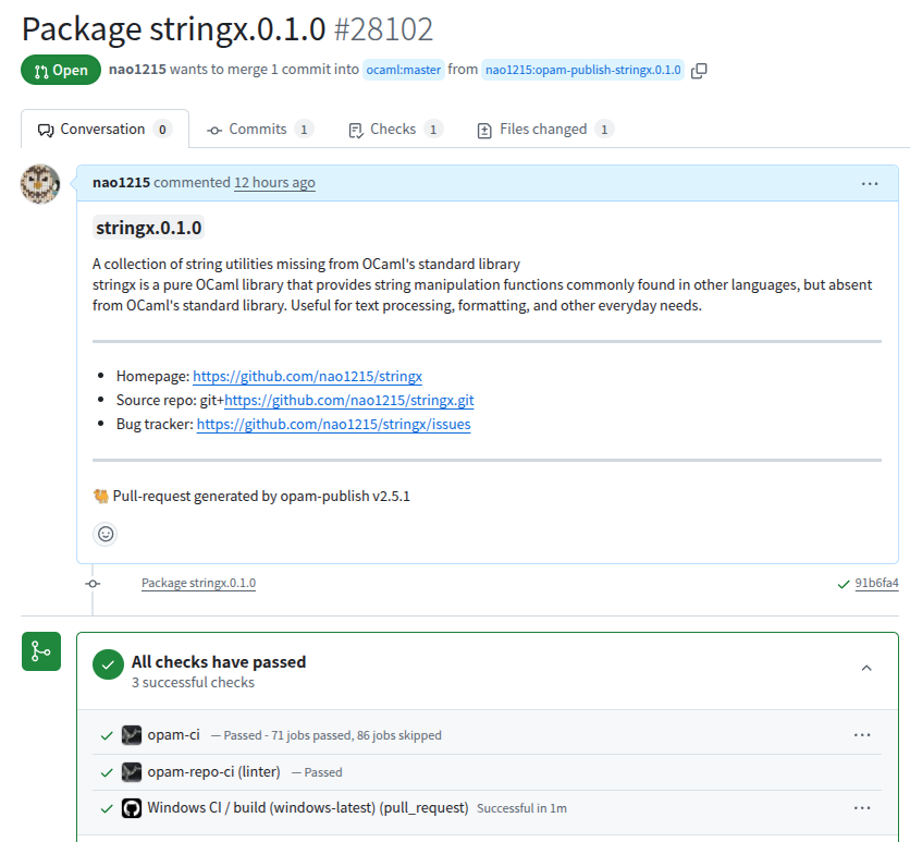 ビルドやテストが通り、依存関係の情報を正しく記載できた後は、公開するだけです。OCamlの場合は、ocaml/opam-repository に Pull Request を作る必要があります。私は、他人のリポジトリにPRを好んで作るタイプではないので、ここで少し抵抗感がありました。