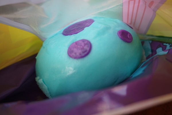 この辺りから疲労が蓄積し始めました。この時、時刻は14:30ぐらいだったため、レイジング・スピリッツの近くで昼食を兼ねた二度目の休憩。買った食事は、食欲が失せそうな青色の肉まん、抹茶ラテ。この青色は、モンスターズインクのキャラ色。モンスターズインクに愛着もないし、そうなると青色はアメリカ人の色彩感覚みたいだし……ただ、食べれば美味しかった。特に、抹茶ラテは、この日に食べた物で一番美味しかった。