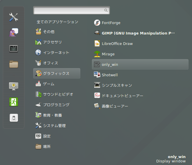 今回の例では、アプリカテゴリ=グラフィックスとして設定しているため、下画像のようにグラフィックスメニューにデスクトップアイコン(ショートカット)が表示されます。