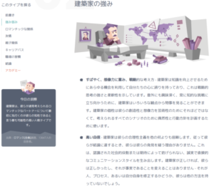 診断結果の例ですが、私の場合は「建築家型(INTJ-A / INTJ-T)」と診断されます。以下の引用のような概要に始まり、強みもしっかりと説明されます。