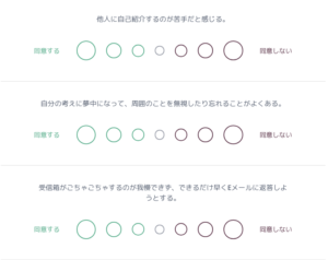 性格を16通りのいずれかに分類するために、10分程度で100件近い質問を回答する必要があります。質問は、以下の画像のように、「同意する(賛成)、同意しない(反対)、中立」から自分に当てはまる回答を選択します。どちらかと言えば同意する、といった回答方式も可能です。