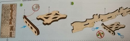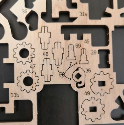 Ugearsの組み立て方は、説明書もしくは説明動画を見ながら、木のプレートから部品を取り外し、ハメ込み作業を行うだけです。説明書は日本語に翻訳されていません。しかし、下図のように使用するパーツ番号やハメ込み位置が丁寧にビジュアライズされているため、組み立てで迷う事は少ないでしょう。