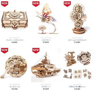 製品のラインナップは、鉄道や車、TRPG用のキットなど、男性が好みそうなオブジェが多いです。女性向けの製品が無い訳ではなく、下図の蝶やアンティークボックスなど、見た目が美しい製品も多数存在します。金額は製品サイズと精巧さによって異なり、おおむね約5000円程度という感覚です。