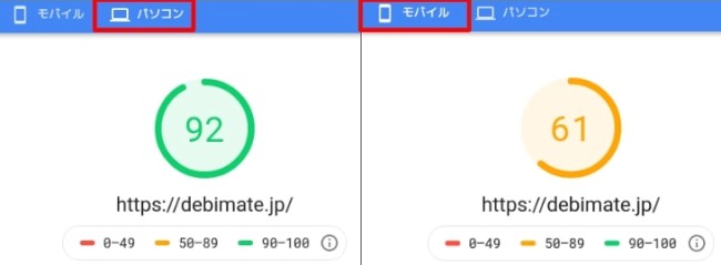サイトの速度面も、もう少し頑張れよ、という気もしましたが……(以下の画像はPageSpeed Insightsの結果で、100に近い方が速い)。これ以上はWordPressテーマやプラグインを修正する必要があり、私のHTML/CSS/PHPスキルだと厳しい。悲しい。