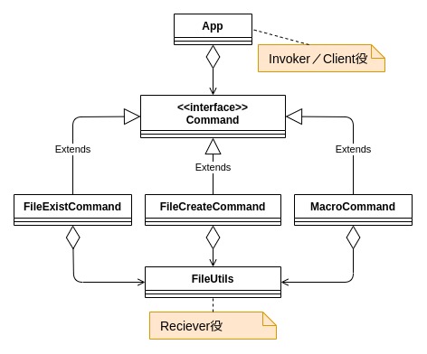 複数のコマンドを処理するMacroCommandクラスは、Commandインターフェースを実装したクラスをリスト形式で保持し、リストの内容を順次実行します。今回の例では、ファイル作成コマンド→ファイル存在確認コマンドの順で処理が実行されるように、実装します。