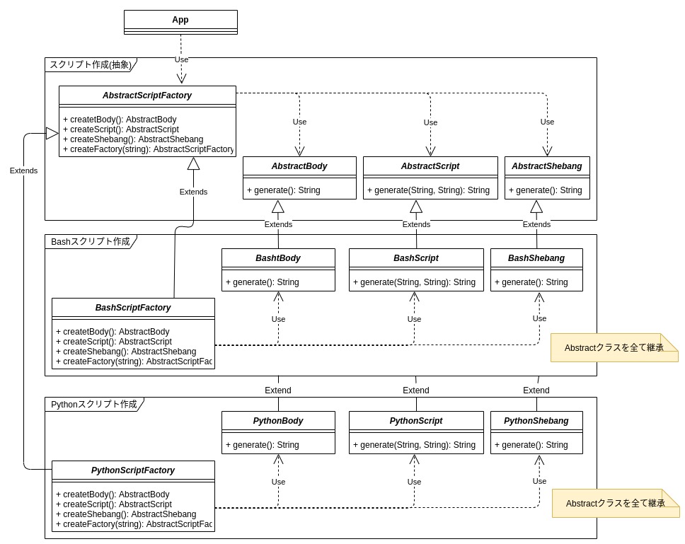 各インスタンスの生成処理がAbstract Factoryパターンによって統一されているため、Bashスクリプト作成もPythonスクリプト作成も、同じ手順で行なえます。