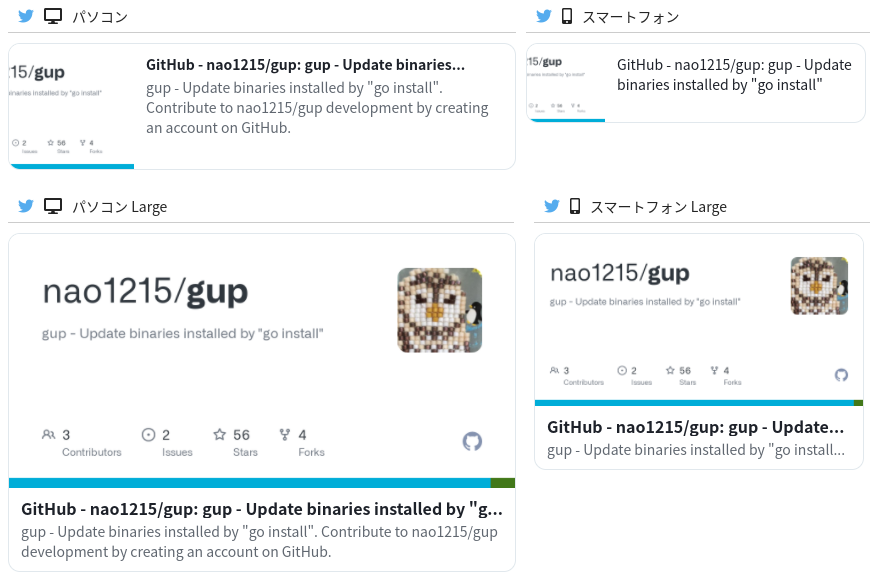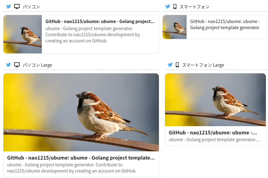 以下、OGP設定がされている場合とされていない場合の比較です。ちなみに、下側(ubumeコマンド)はOGPを設定していますが、Starを獲得できていません!