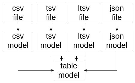 この雑さを反映するように、sqlyでは「ファイル形式と一対一対応するモデル(例:CSVファイルに対応したCSVモデル)」と「DBテーブル一つに対応するモデル(Tableモデル)」が存在し、sqly内部で最終的にTableモデルへ変換するシンプルな構造となっています。
