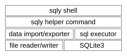 ユーザーとのインターフェースにsqly shell(sqliteやmysqlのクライアントコマンドに似たもの)があり、ユーザーの操作を楽にするためのヘルパーコマンド(例:ファイルをDBにインポートするコマンド)が定義されています。sqlyは、ヘルパーコマンドを経由して、各ファイルを読み書きし、SQLを実行する流れになっています(若干嘘をついています)