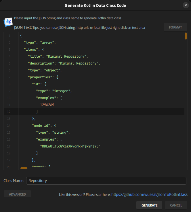 - [Generate Kotlin Data Class Code]画面の「Class Name」フィールドにクラス名を入力。今回はRepositoryとします。