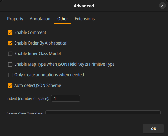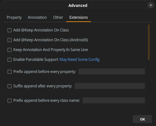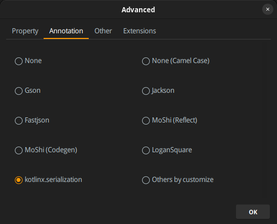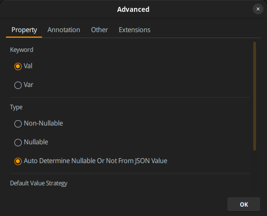 4. [Generate Kotlin Data Class Code]画面の「ADVANCED」ボタンを押下し、生成するdata classの細かい設定を行う(任意)。設定項目を以下の画像で示します。フィールドをValにするかVarにするか、nullを許容するか、どのライブラリでデシリアライズするか等はjsonによって設定値が異なると思われます。