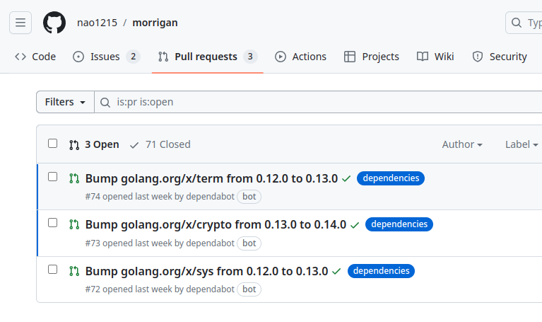このような問題を防ぐために、Dependabotでライブラリ更新を監視する対応策があります。私は、趣味のOSS開発でDependabotを採用しており、Dependabotが定期的に「Bump〜」から始まるPRを作り、ライブラリの更新を教えてくれます。便利ですね。