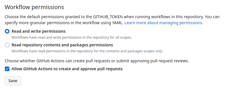 今回の方法では、GitHub ActionsがPRをマージする権限を持っている必要があります。この権限を確認するには、GitHubのリポジトリページを開き、[Setting] > [Actions] > [General] > [Workflow Permission]を確認してください。