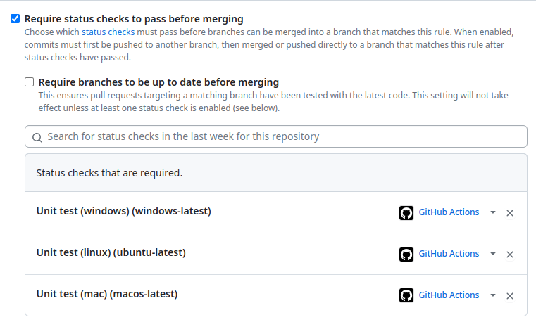 また、GitHub Actionsのテストが通ったときのみ、マージできる設定を有効化します。[Setting] > [Branch protection rule] > [Require status checks to pass before merging] を有効化し、任意のGitHub Actionsを指定します。今回はユニットテストを指定しています。
