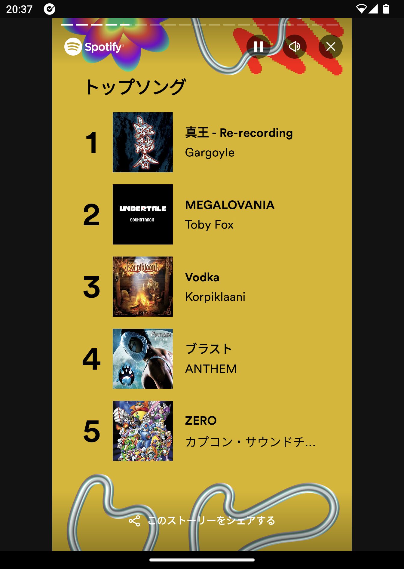 Spotifyによると、2023年は「再生時間64,151分」「聴いたアーティスト1,266組」でした。トップソングは以下の通り。ブラストは、そんなに聴いたかな?