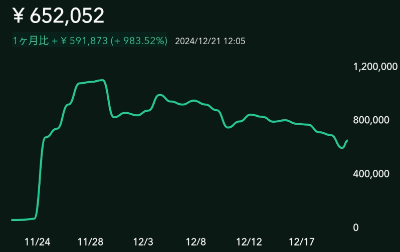 トランプ再選により、米国でビットコインの戦略的備蓄が始まる可能性が高まりました。そのタイミングで買い増しを行ったのですが、行動が少し遅かったので含み損になってます。含み益が出ている時に「確定申告が必要になるから、来年までホールドしよう」と考えたら、直ぐに含み損になりました。数年ホールドしていれば、どこかのタイミングで含み益状態になるだろうと考えてます。