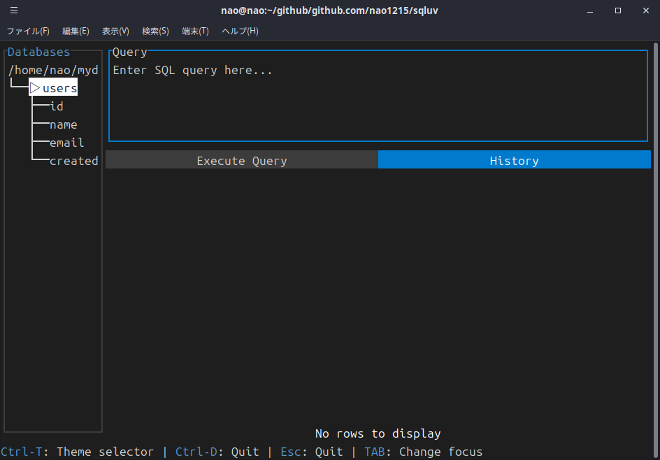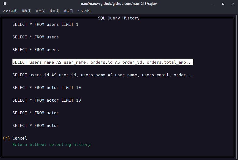 前回の記事段階では、ドギツイ色(デフォルト色)が使われており、「出来悪そうだな……」という見た目でした。現在はカラースキームを内部定義してあり、ユーザーは好きな配色でsqluvを使用できます。カラースキームを確認したい方は、README内のスクリーンショットをご確認ください。