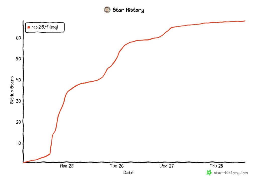 filesql パッケージは、SQL ドライバーであり、SQLite3 のSQL 構文を使用してCSV、TSV、LTSV ファイルにクエリを実行できます。リリースして1週間経っていませんが、過去2番目の勢いで GitHub Star を獲得できています。嬉しいことですね。